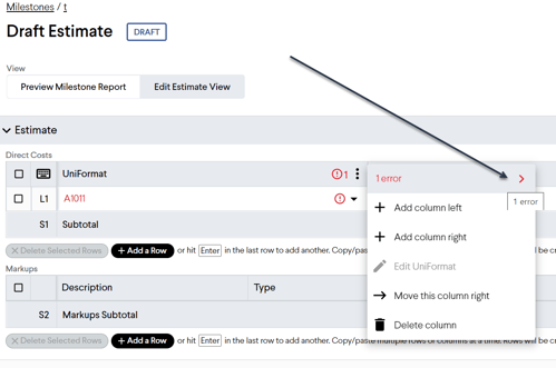 After uploading your estimate or budget, you may notice an error message on the column header or headers of your estimate or budget. This means that the category you’ve imported doesn’t exist in Join. If this happens on either the UniFormat or MasterFormat column, you’ll need to correct the error by finding another code that best matches what you’ve imported.