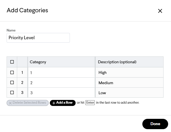 - Label the second column with "New Categorization - Name". The values in this column will import into the Description column in the screenshot of custom categories below. A value in this column is optional.
