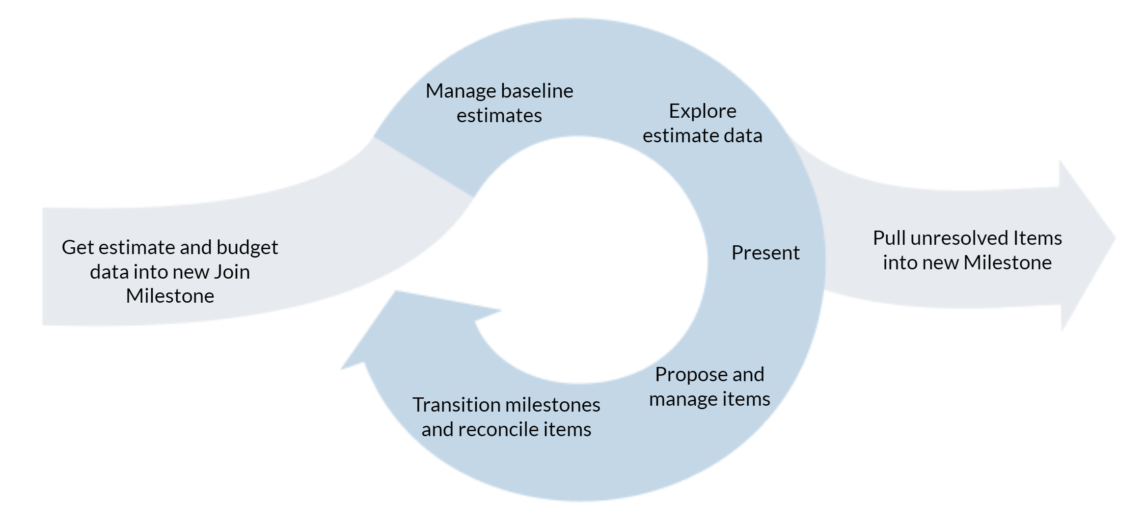 As new design iterations become available, they can be modeled by your VDC team for constructability analysis and then estimated in your estimating solution. You would then import the estimate into Join to allow the team to visualize this new Milestone data virtually or live in an OAC meeting.  Any unresolved Join Items from previous Milestones can be pulled forward into this new Milestone. This allows you to reassess these Items in light of the new Milestone information and add new Items to discuss and evaluate with the project team.